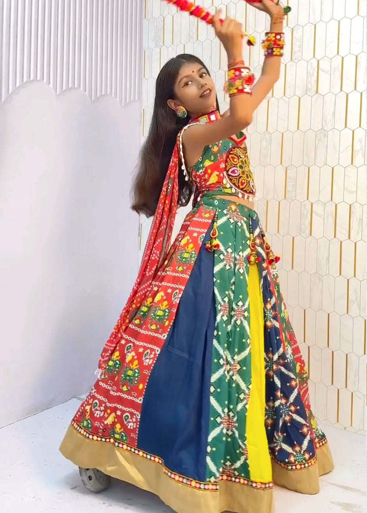 Work | Printed work on lehenga with vibrant multicolor panels, Gamthi embroidery work on choli, and delicate mirror work on dupatta |
