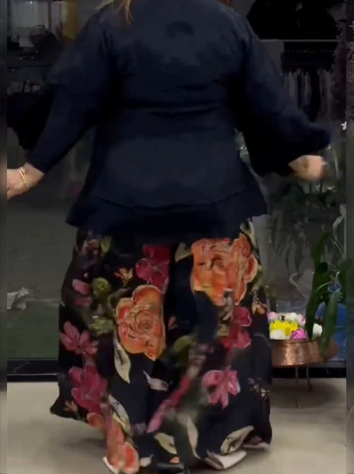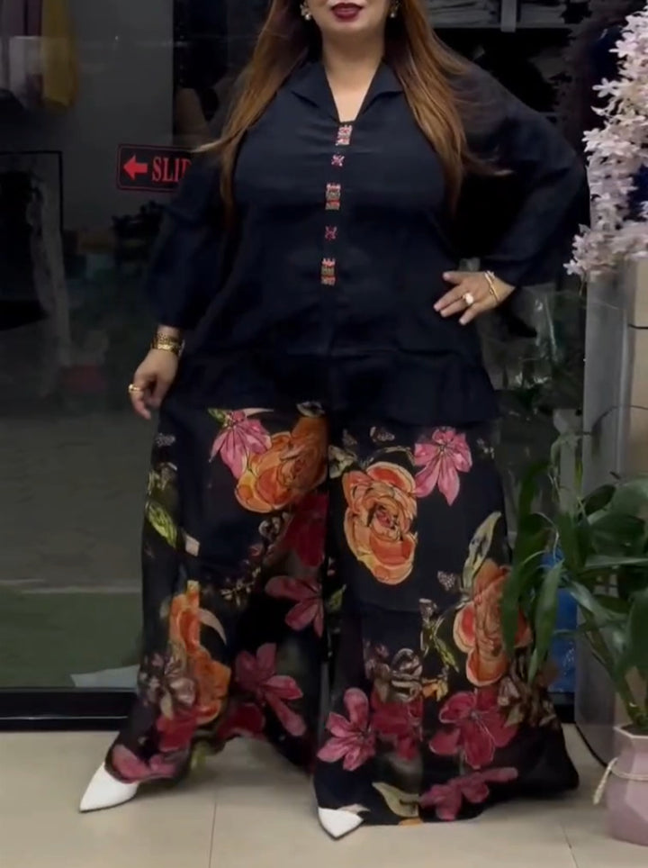 Color Palette: | Top - Jet Black; Bottom - Black base with multi-color floral accents |