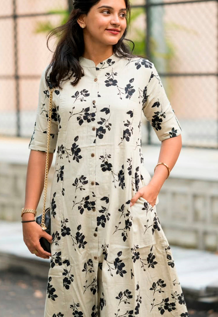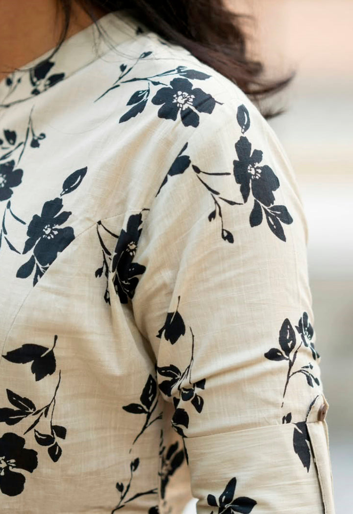 - Detailed with black floral prints on a serene off-white base, giving a modern yet timeless aesthetic.