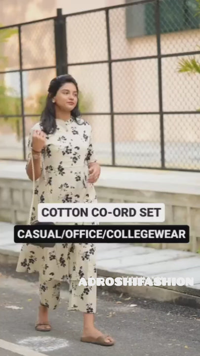VARNI Fancy co-ord set made from breathable and lightweight cotton fabric. The material is printed with a beautiful floral design, giving it a chic and casual look.