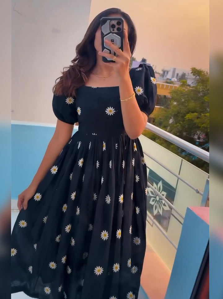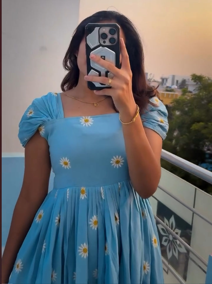 Embroidery Work | Delicate thread embroidery in daisy floral patterns, intricately scattered all over the dress |