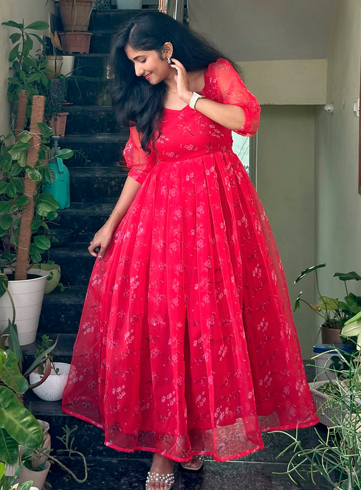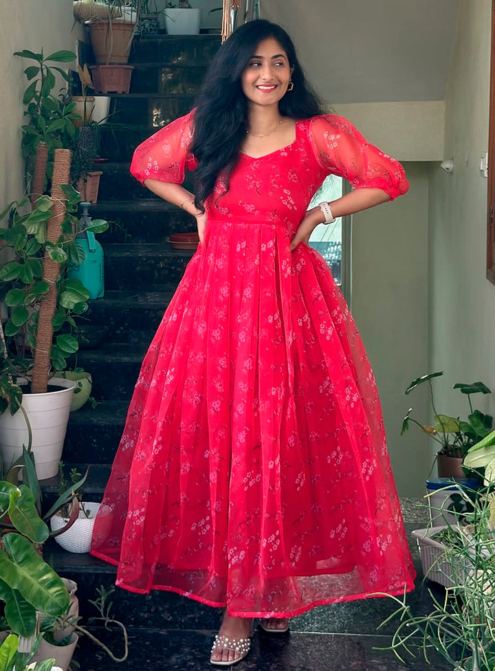 Turn heads with the ZAYRA LONG WESTERN GOWN, a perfect blend of elegance and charm. Crafted from lightweight, flowy fabric, this vibrant lite pink maxi dress features delicate floral prints scattered across its sheer overlay, creating a soft, romantic vibe.
